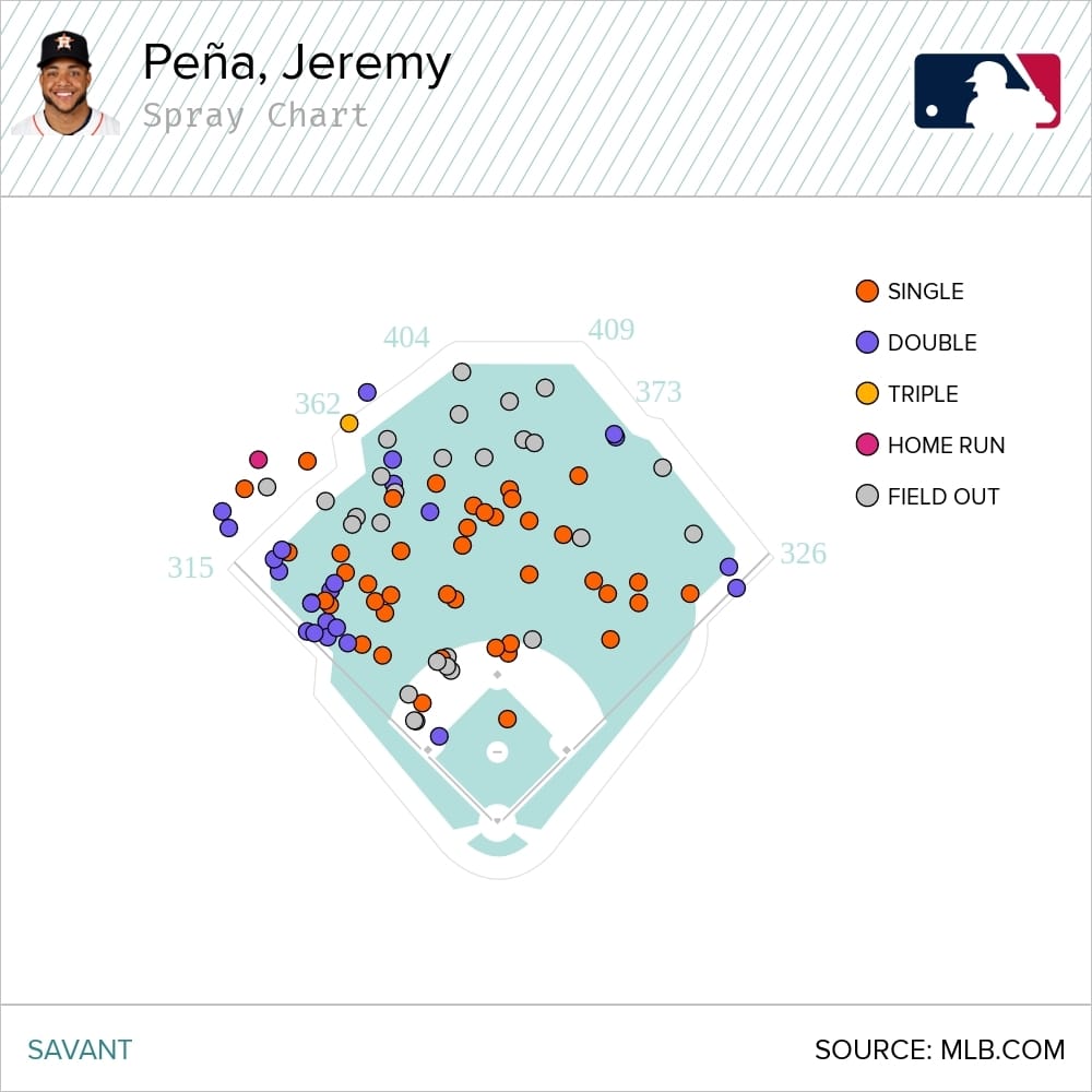 Sure, you could point out some flaws against breaking balls and offspeed. In fact, Peña whiffed on nearly 50 percent of the swings he made against offspeed pitches. Breaking balls were a bit better as Peña made contact on 65 percent of those swings, and he put up a .277 batting average against. A major part of that is his more open stance and getting back to square at contact.